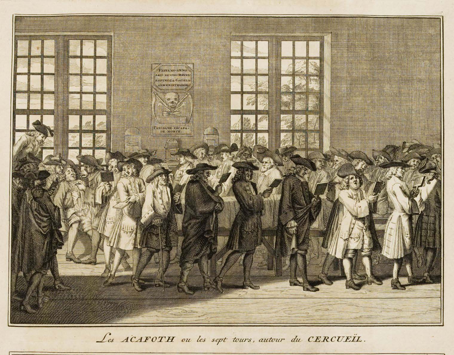 The texts of hakafot and haschava are printed on two sides of wooden signs, available at the Beth Haim. The first two pictures show the signs, the last the short Below: the Metaheer house - Casa dos Rodeamentos (1705), the house of circuits named for the 7 circlings (הקפות) made around the casket of a man as it lies in the building before being carried to its burial spot in the grounds, as etched by Picart in the beginning of the 18th century, and how it looks after the renovation of 1966. Note the remarkable sculpture between the windows, in the picture shown on the right side.