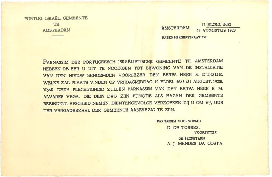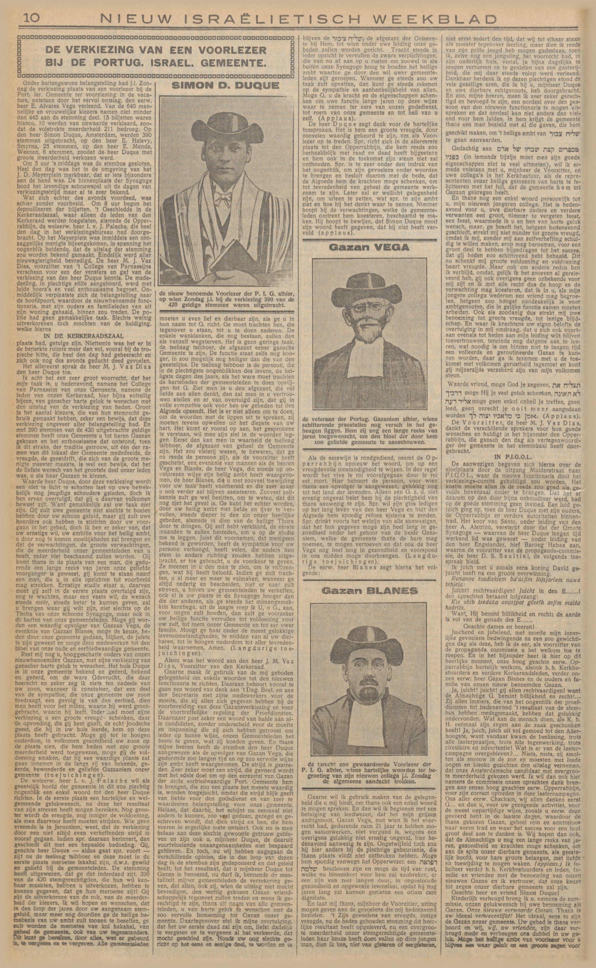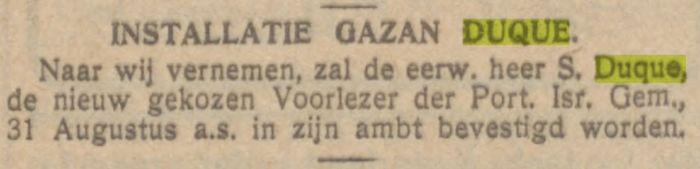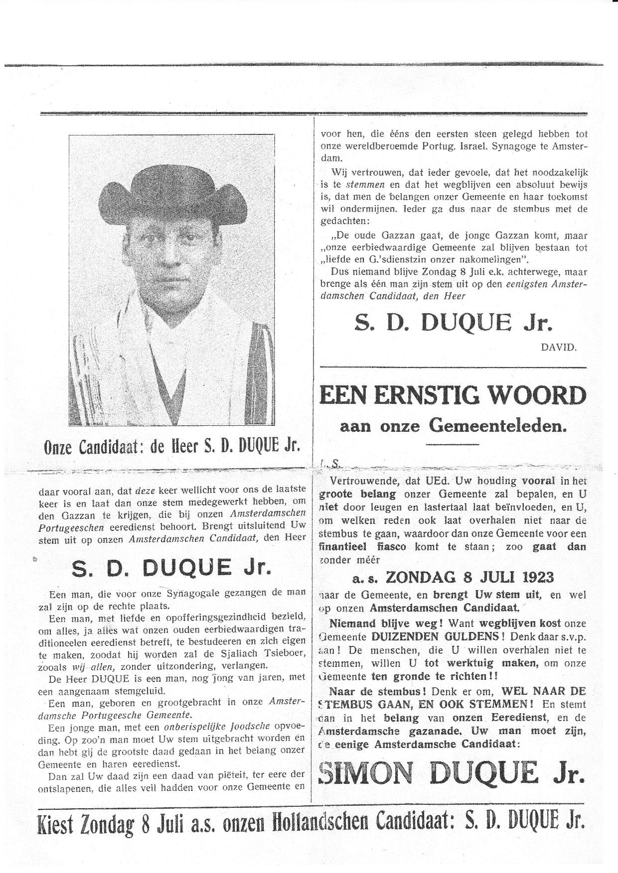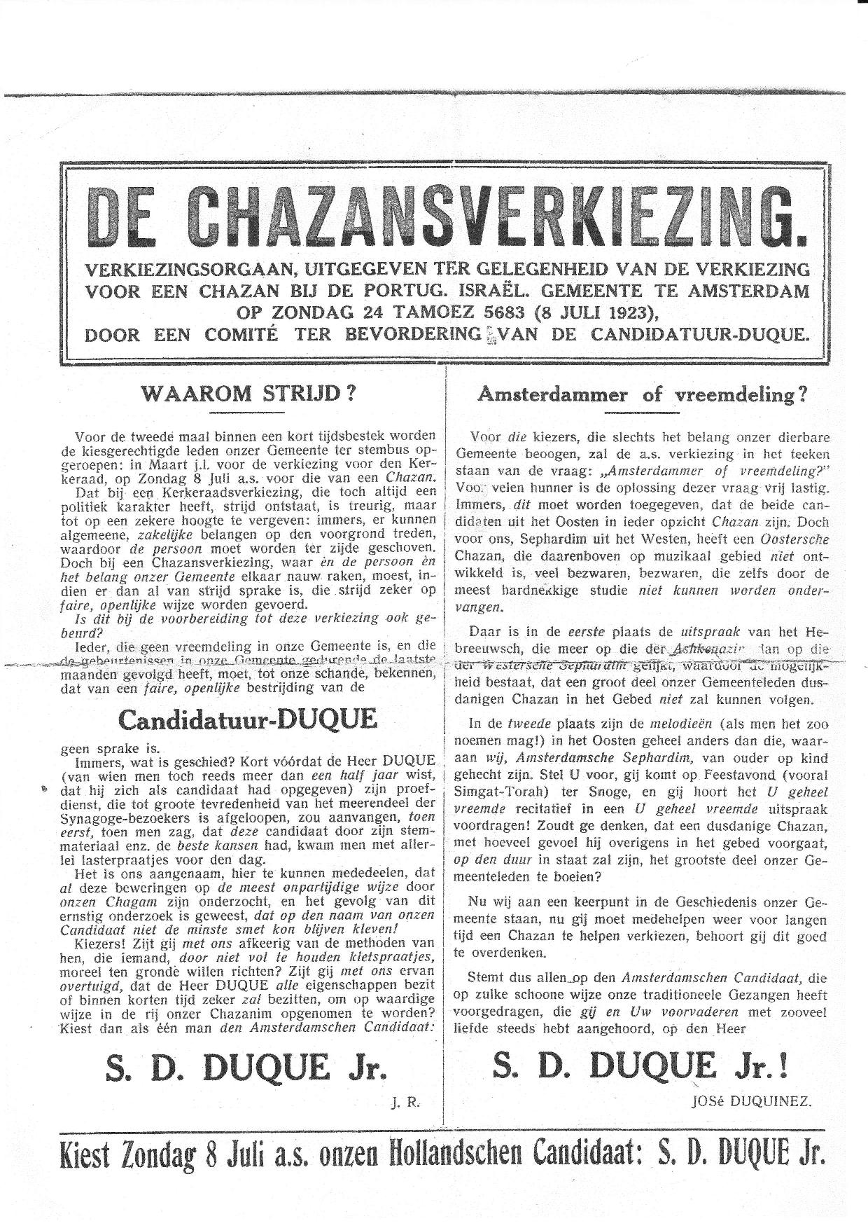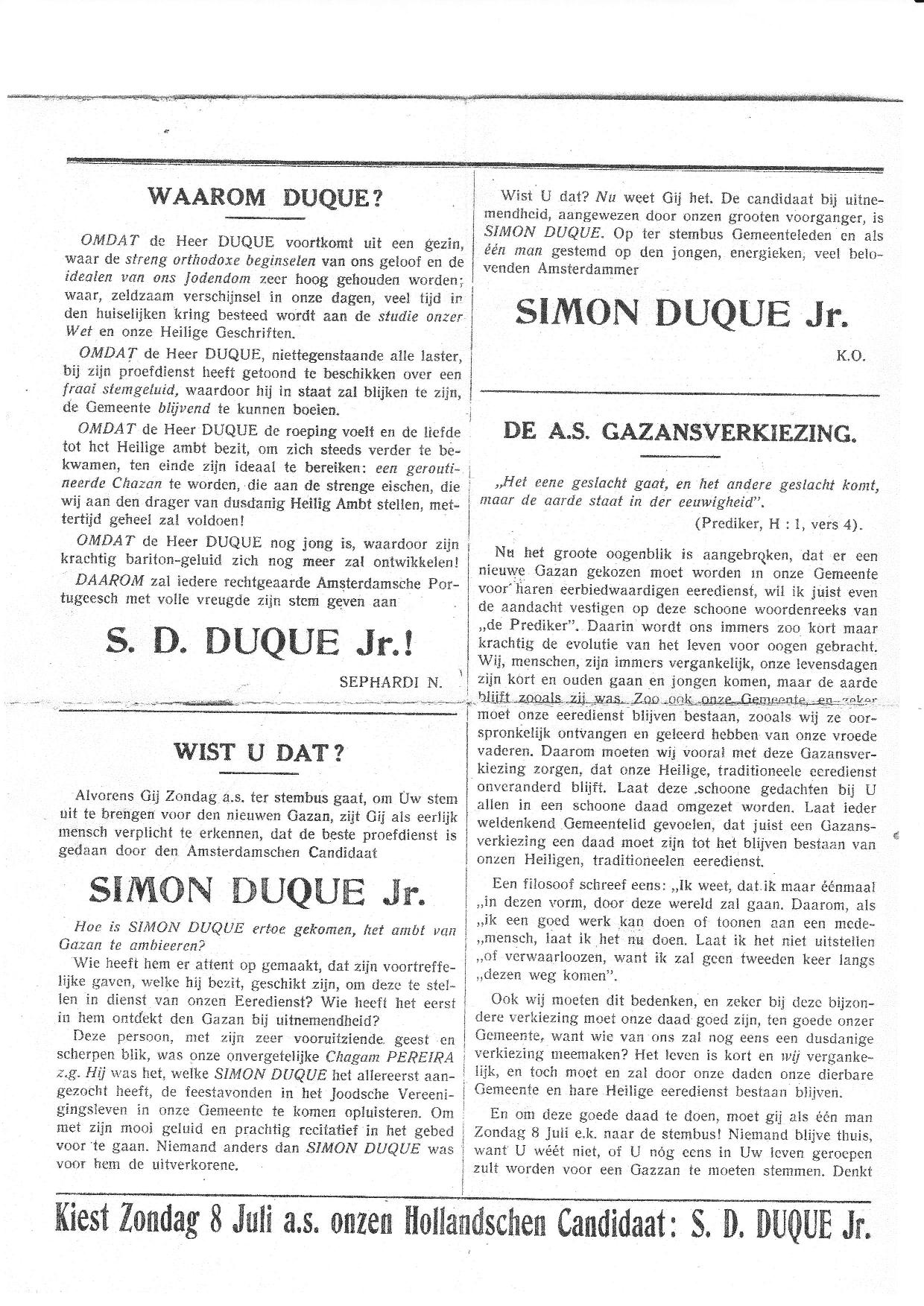 Chazzan DuqueChazzan Simon van (son of) David Duque was named to his post after a heated election on 8 July 1923. He had a beautiful, forceful and musical voice which perfectly fitted the large esnoga. He was born in Amsterdam on 14 March 1897 and died in Dachau, Germany, on 19 January 1945. He refused a position in Ramsgate in 1938 in favour of the Snoge. The unique recording of Hanerot halau was rehearsed many times, until it was timed to fill the whole available 3 minutes on the record.
