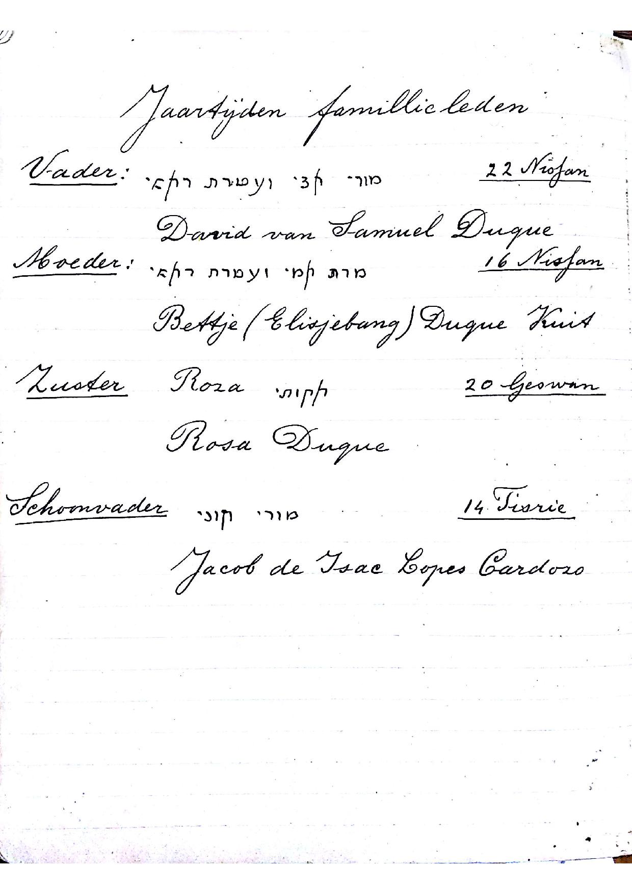 11, the house from where family Duque was deported to be murdered. Each chazzan used to maintain his own "eleven months register" containing the names of members who died the last eleven months. This register was used for the eleven months Hashcavah, which is a memorial prayer for the dead, recited a.o. on each shabbat. After the war we continued to use Duque's "eleven months register". See below a picture of the booklet and a picture of the last page, where he noted members of his family. Today we refer to the "eleven months register" as the "gele boekje" (yellow booklet) for obvious reasons. |