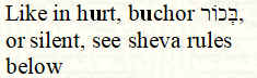 Sheva rules. A short summary of the shuva rules: Sheva Na rules, as formulated by R’ Eliyahu Bachur (16th cent.). It 1) occurs under the first letter of a word; 2) is the second of two Shevas in the middle of a word; 3) occurs after a long unaccented vowel; 4) occurs under a letter which has a Dagesh; 5) occurs between identical letters. All other Shuvas are Nach (‘silent’). The letters begad kefat normally receive a Dagesh at the beginning of a word or in the middle of a word after a Shuva Nach