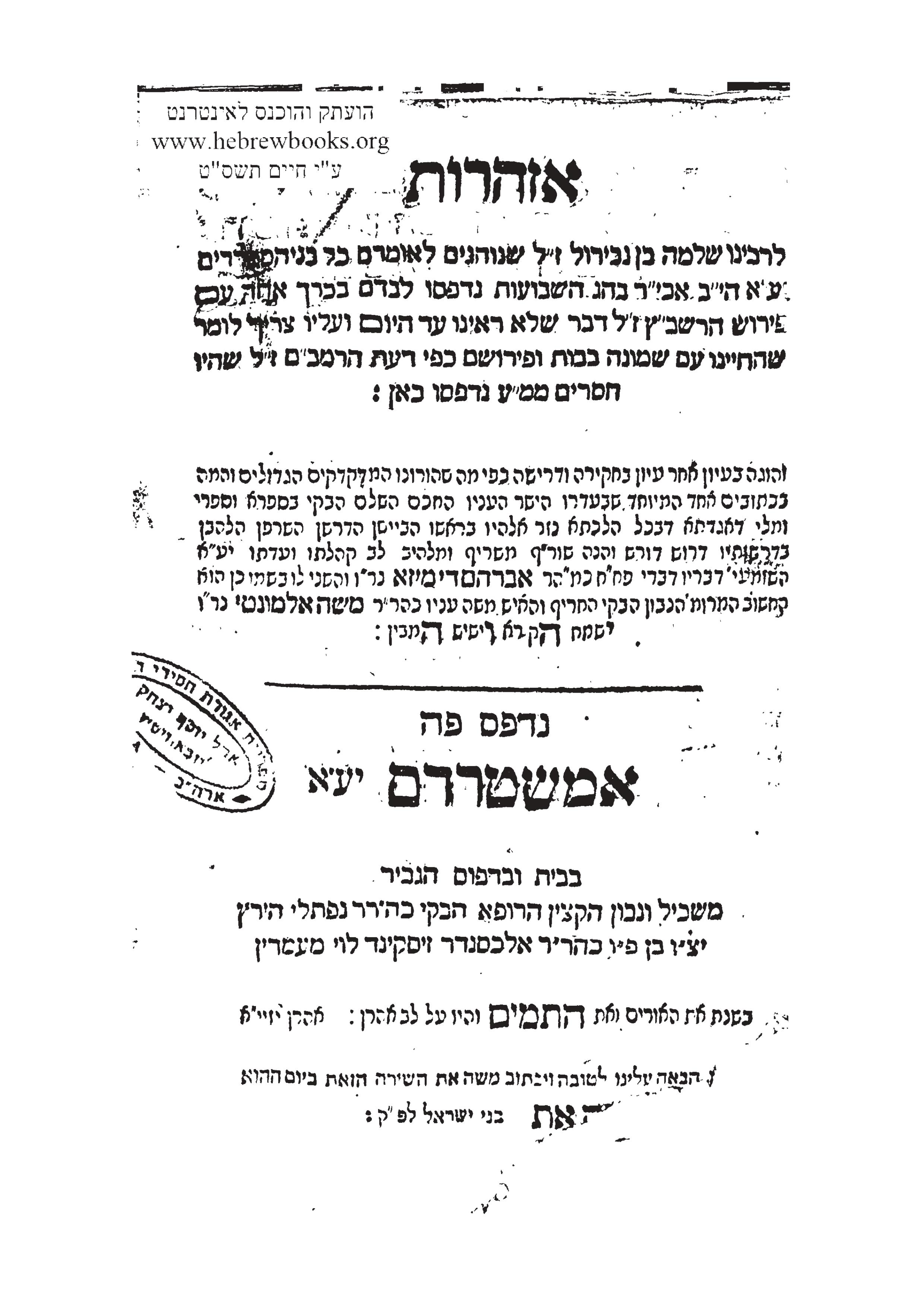 AzharotAzharot are read before Mincha on both days of Shavu'ot, followed by Ruth. On pages 217-218, Mulder adds a remark and eight verses, which cannot be found in our older Mo'adim books, and are indeed not read. This is the text: ודע שהאזרות אלו הם כדעת בעל הלכות גדולות ותרי"ג מצות שלנו הם כדעת הרמב"ם אשר חי כמה שנים אחר בעל הלכות גדולות * והחילוקים הם ל"ב * וקם איש חכם ונבון משורר גדול הרב שמעון בר צמח ובנה לנו שמונה בתים לישר האזרות גם לדעת הרמב"ם * ולפי שמצינו שהרב הגדול חיד"א בספרו מורה באצבע כתב לומר המצות בשבועות כדעת הרמב"ם אציגה לפניכם שמונה בתים אלו * והם הם אשר נדפסו בספר האזהרות עם פירש קצר מהרשב"ץ הנדפס באמסטרדם שנת בתמים (עיין שם הגדולים ערך אזהרות) Which translates to: